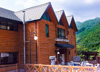 緑豊かな山懐に、ログハウスの建物の二ノ丸温泉があります。