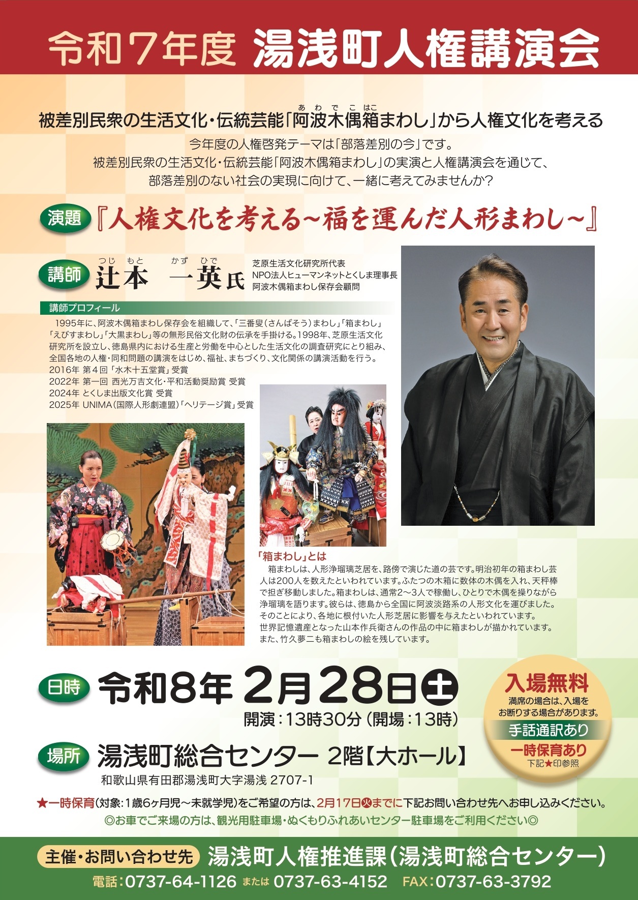 今年度の人権啓発テーマは「部落差別の今」です。被差別民衆の生活文化・伝統芸能「阿波木偶箱まわし」の実演と人権講演会を通じて、部落差別のない社会の実現に向けて、一緒に考えてみませんか?